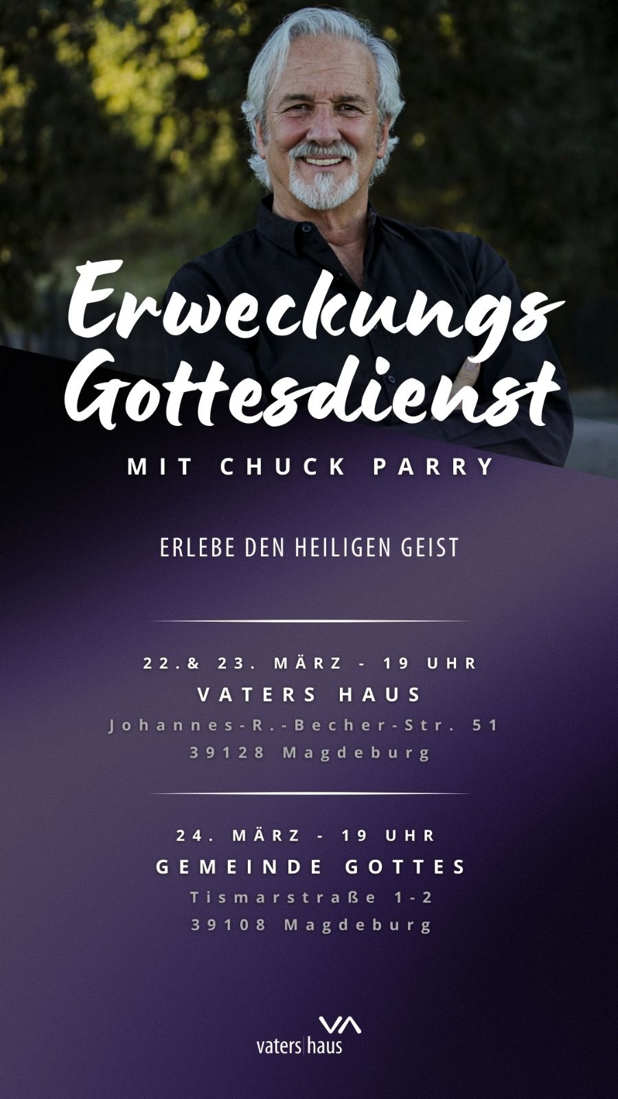 March 22 @ 7:00 pm - 9:00 pm Erweckungs Gottesdienst MIT CHUCK PARRY 22. & 23. März - 19 Uhr Vaters Haus, Johannes-R-Becher Str. 51 39128 Magdeburg …